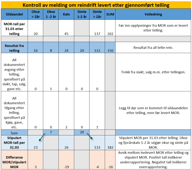 Telleresultatet brukes for å kontrollere siidaandelens oppgitte reintall i melding om reindrift (MOR). Telleresultatet kan brukes for å regne seg tilbake til et minimums reintall siidaandelen hadde ved sist melding om reindrift før telling. Dette gir en tilbakeregnet MOR. Telleresultatet kan også brukes for å vurdere sannsynligheten for om det er riktige opplysninger som er oppgitt i sluttstatus i melding om reindrift som leveres etter at telling er gjennomført. Dette gir en stipulert MOR.