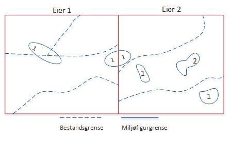 Utfigurering kan skje på tvers av bestandsgrenser, men avgrenses av eiendomsgrenser. Der et livsmiljø strekker seg på begge sider av en slik grense etableres det en ny figur med egne registreringer på naboeiendommen. Dersom figuren i svært liten grad avviker fra bestandet kan grensene for miljøet av praktiske hensyn tilpasses bestandsgrensen. Figur 1 viser prinsippene for utfigurering innen bestand og på tvers av bestands- og eiendoms-/teiggrenser.