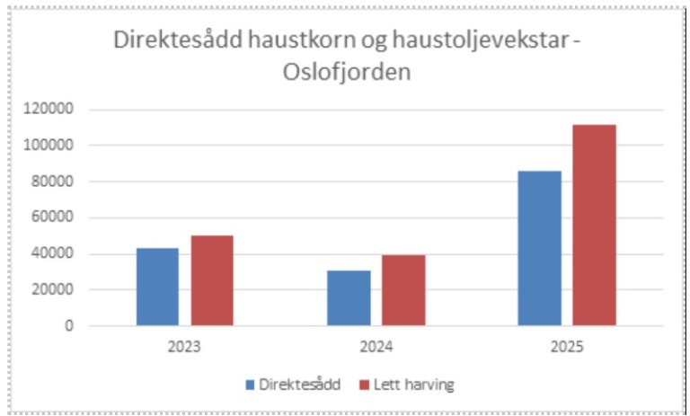 I 2025 var det ein nedgang på nesten 7 % for tiltaket ingen jordarbeiding om hausten. Årsaka til dette skuldast truleg at mykje areal vart haustsådd. Vi ser at det var ein markant auke i etablering av haustkorn etter hausting av fjorårets avling. I regionale miljøtilskot i jordbruket heiter dette tiltaket direktesåing av haustkorn og haustoljevekstar.
