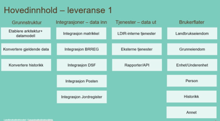 Hovedleveranse 1 er planlagt 1. mars 2026 og inneholder tilstrekkelig til å ta å ta det gamle Landbruksregisteret av lufta.